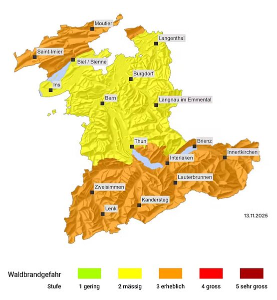 Die Waldbrandgefahr wird in folgenden Regionen des Kantons Bern als «erheblich» beurteilt: