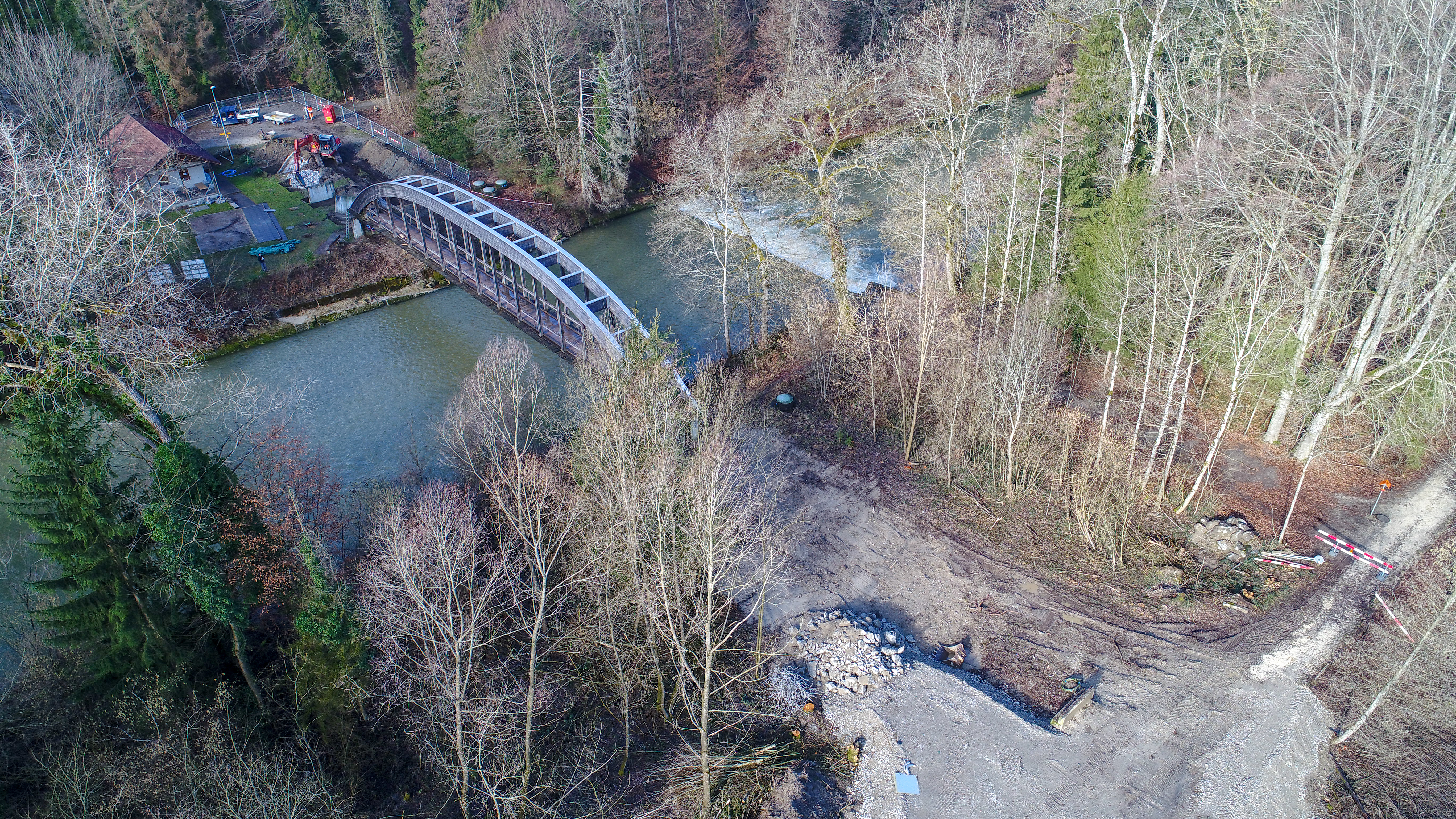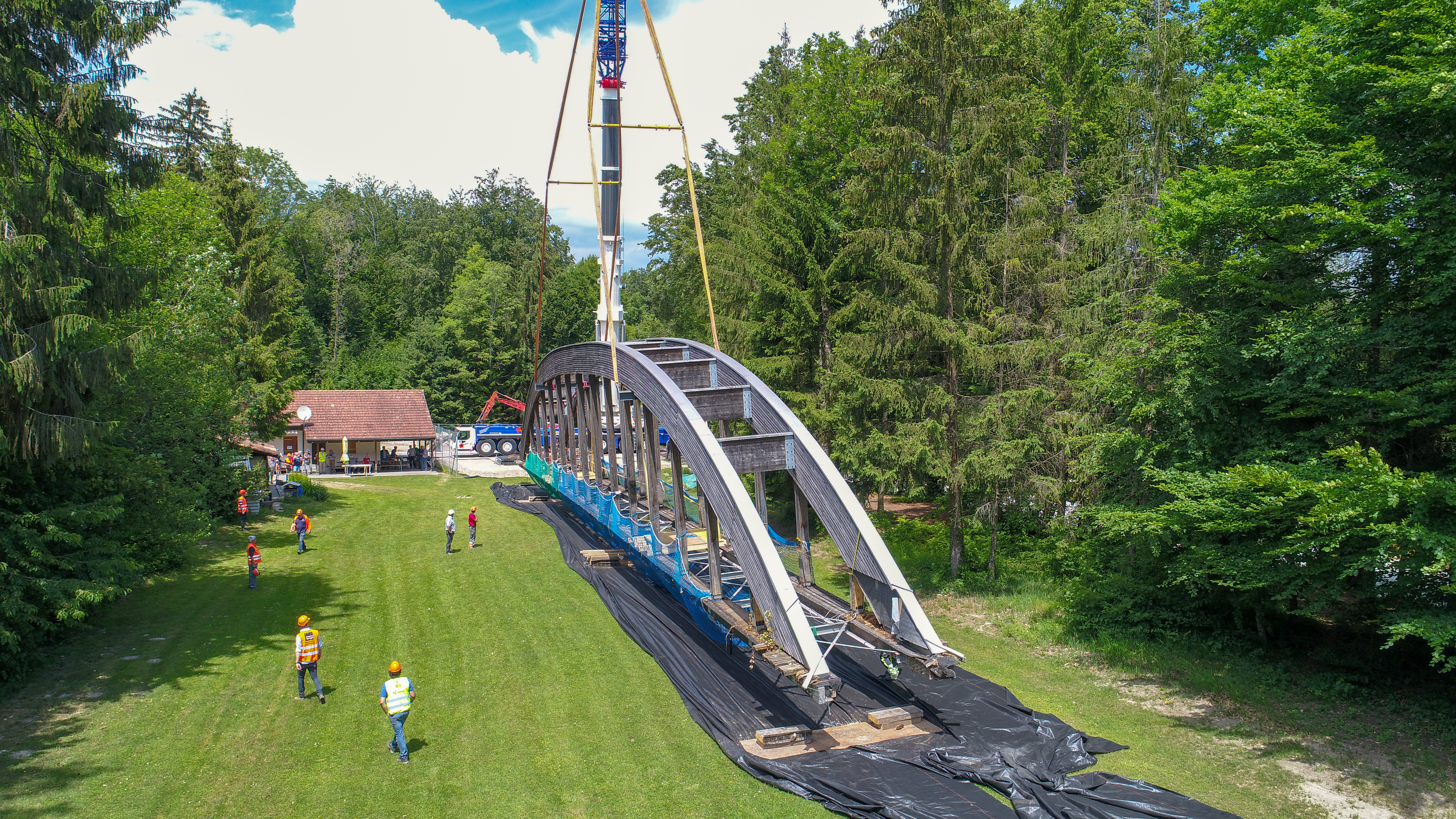 Heute wurde die alte Holzbogenbrücke herausgehoben und auf dem Hornusserplatz abgestellt.