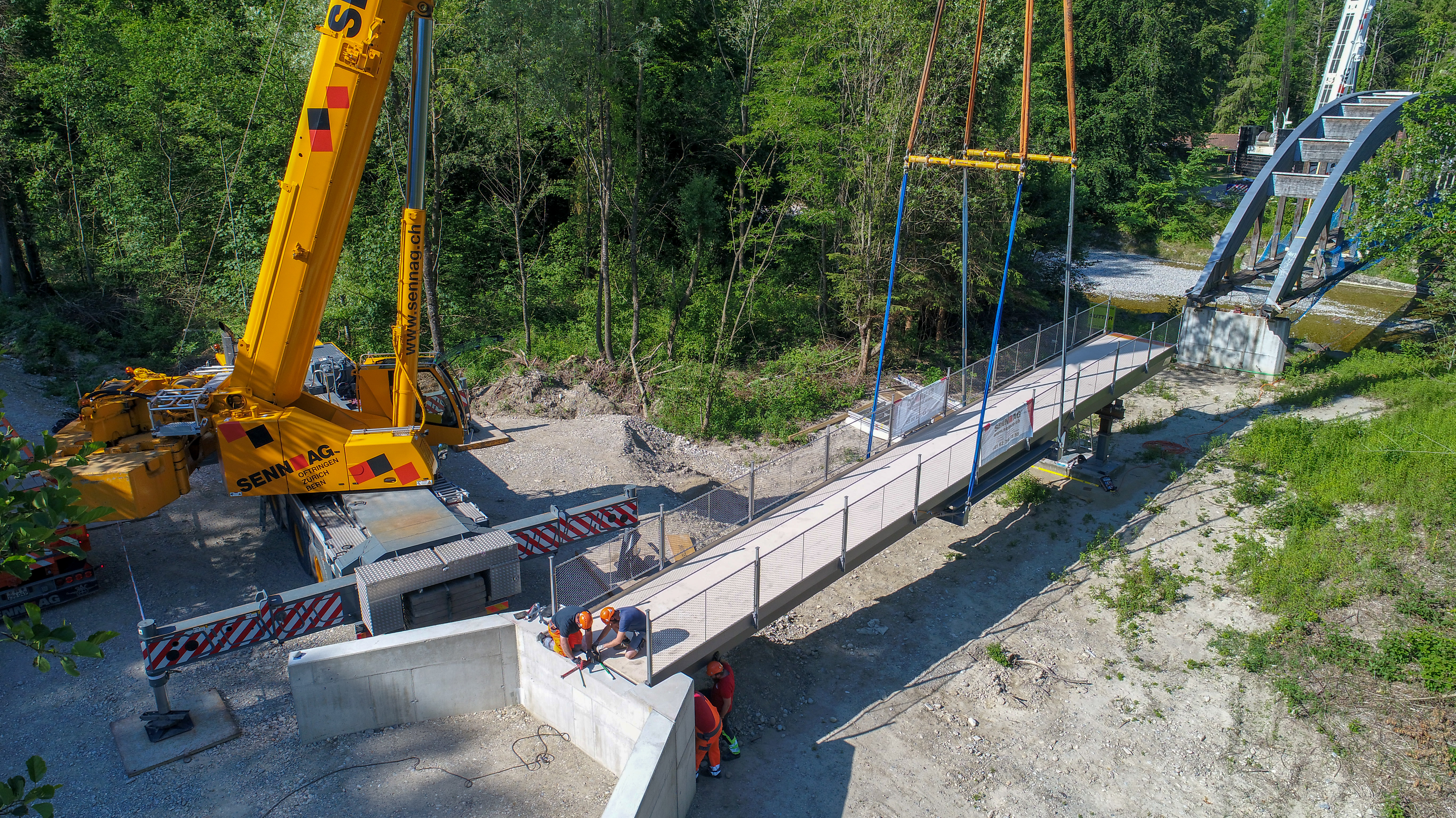 Auf der Ostseite wurde heute der erste Vorlandsteg in Position gebracht und montiert.