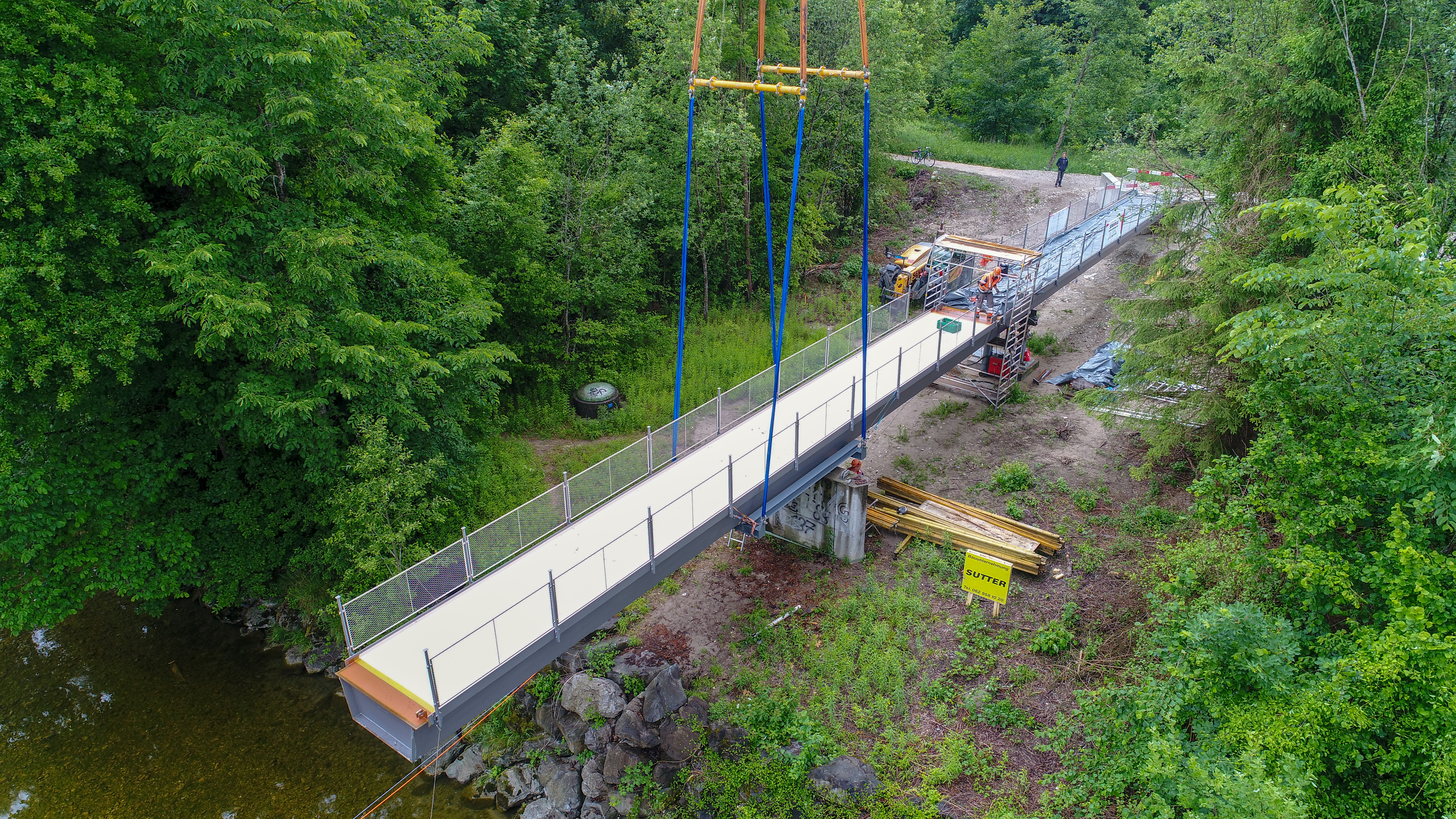 Heute wurde das letzte Element welches die Brücke nun verbindet eingebaut. In den folgenden Wochen wird die Brücke zusammengeschweisst.