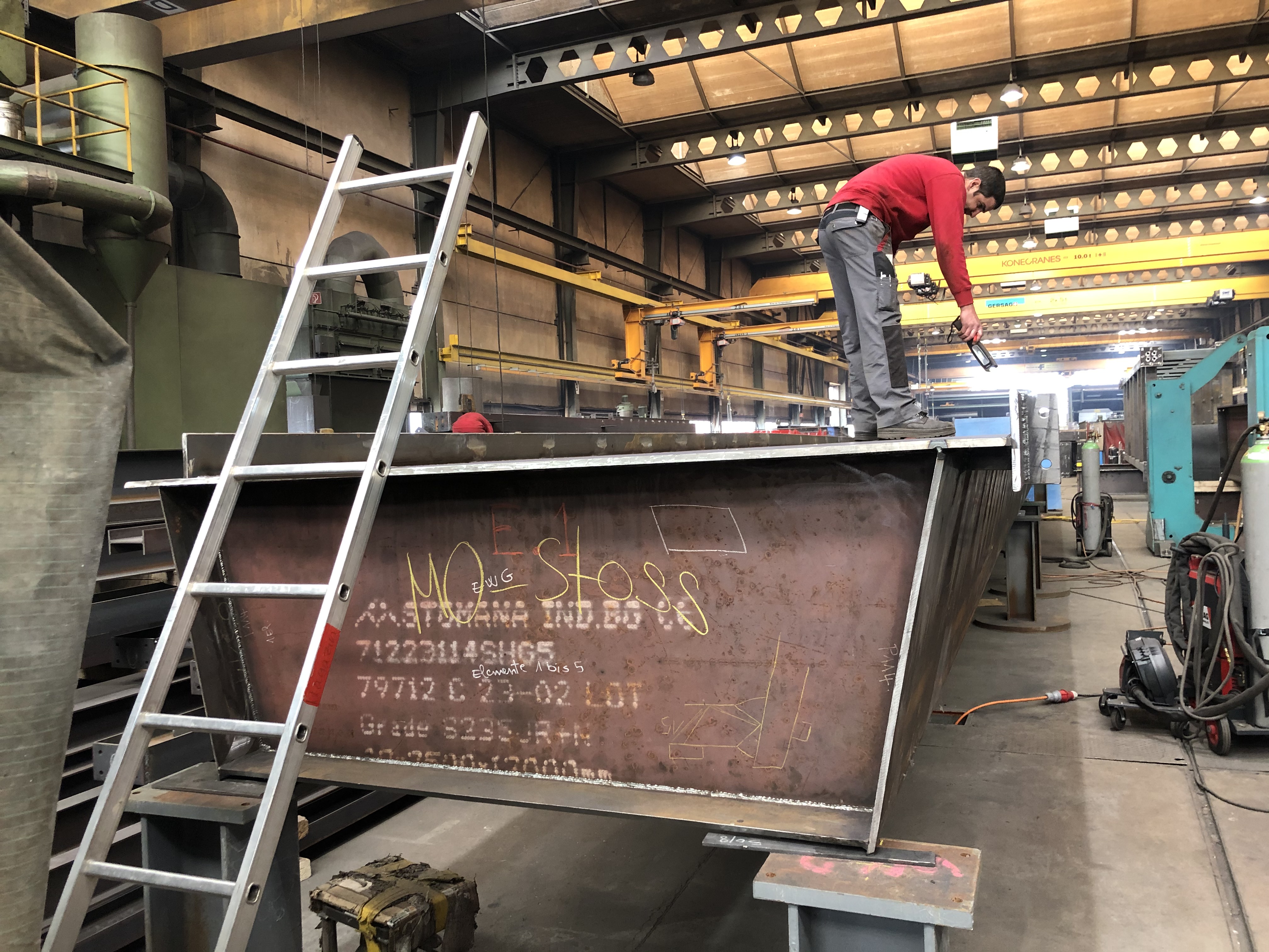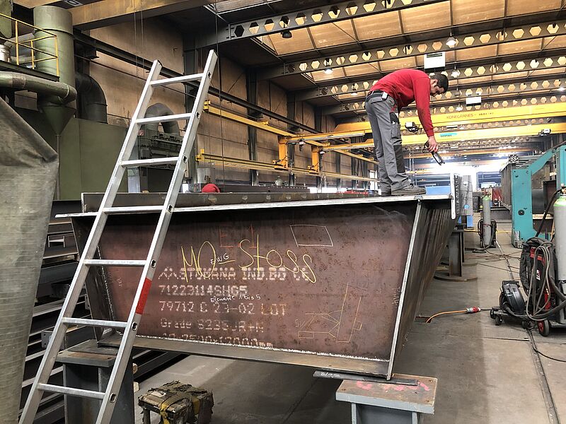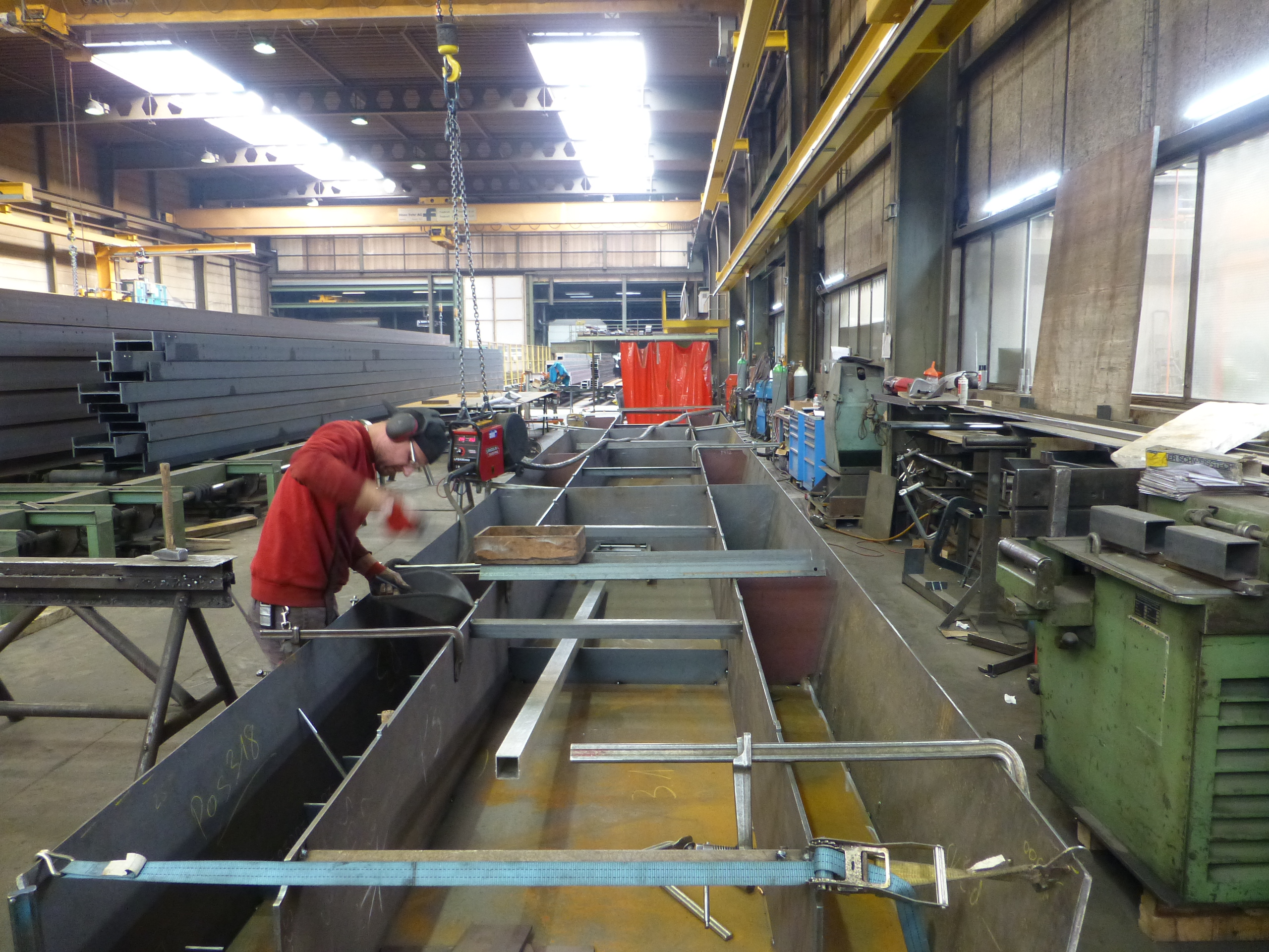 In der Werkstatt werden zurzeit die fünf rund 20 Meter langen Elemente der Stahlbrücke gefertigt. Nach dem Zusammenfügen der Elemente werden die Stahloberflächen gereinigt und mit einem Korrosionsschutz in grauem Farbton beschichtet. Die fünf Elemente werden anschliessend in Sondertransporten nach Bätterkinden gebracht, einzeln eingehoben und an Montagestössen miteinander verbunden. Die einzelnen Elemente wiegen bis zu 20 Tonnen.