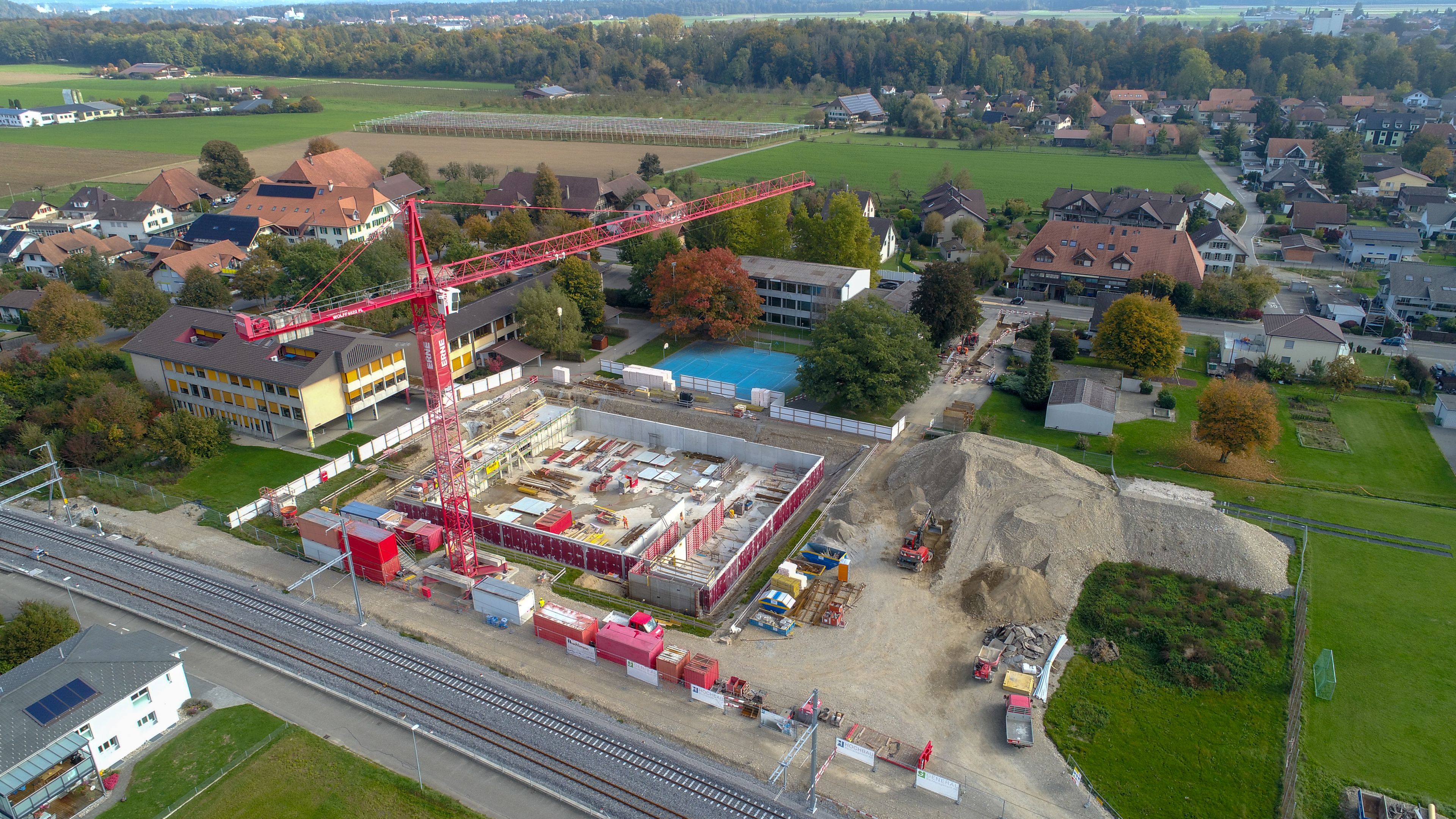 Der Zugang zu den Schulanlagen wird während der ganzen Bauzeit gewährleistet. Die Sicherheit der Schüler*innen hat dabei höchste Priorität. In der ersten Phase erfolgt der Zugang zur Baustelle für den Baustellenverkehr über die Baupiste entlang der RBS-Bahnlinie. In der zweiten Phase, dem Abbruch der alten Turnhalle und Erstellung des neuen Allwetterplatz, erfolgt der Baustellenverkehr von der Solothurnstrasse her.